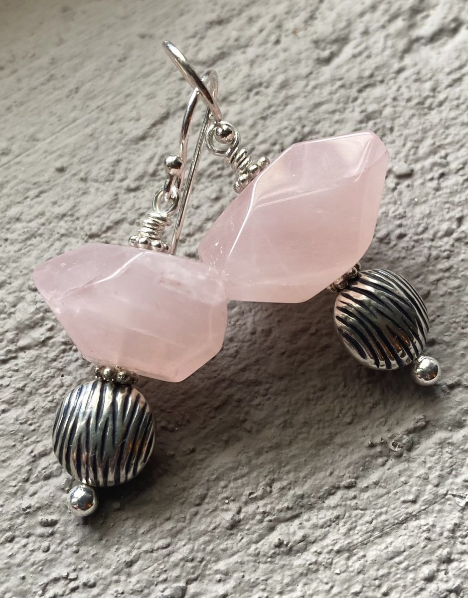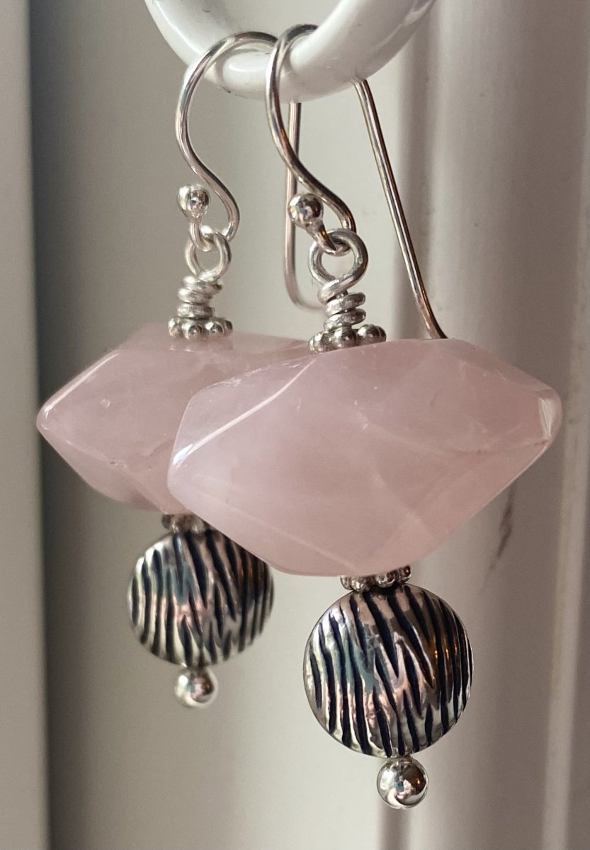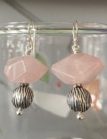 Et meget smukt og unikt par øreringe i fin blankslebet rosakvarts og fine rillede sterlingsølvperler i let oval facon. Klassisk ørebøjle i sterlingsølv.